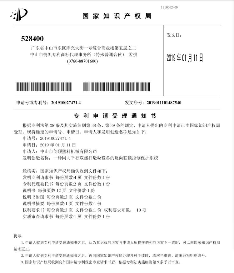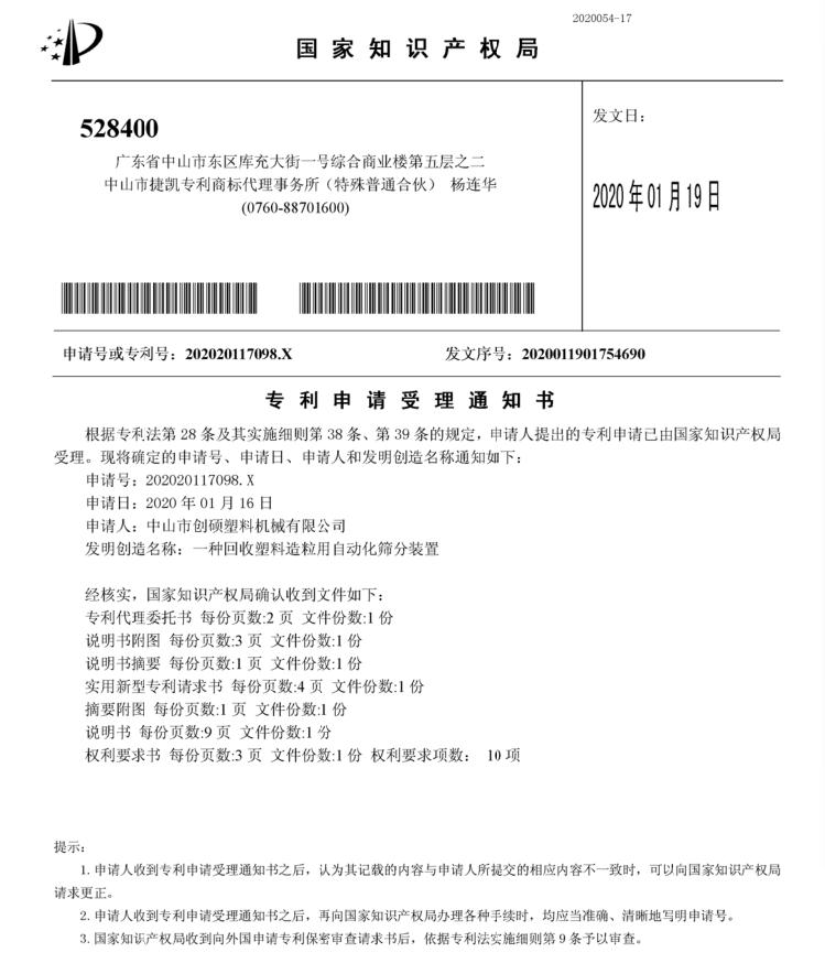 創(chuàng)碩塑料機械2020年專利申請受理通知書公示